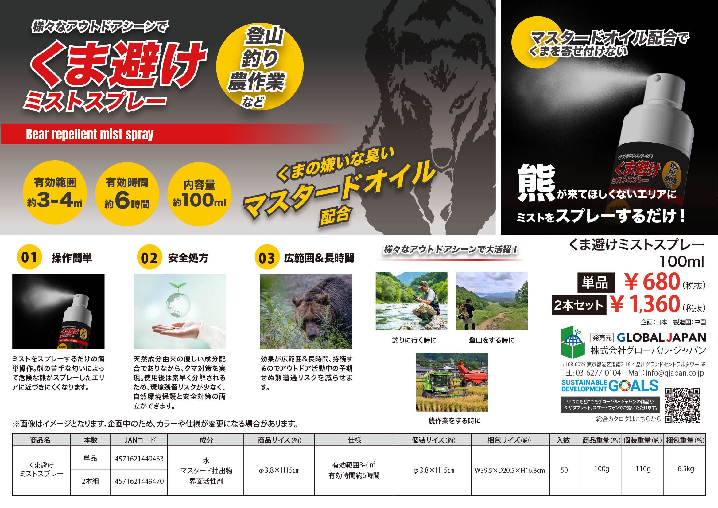 登山・釣り・農作業などのアウトドアシーンで活躍する、くま避け用ミストスプレーです。くまの嫌いなニオイ「マスタードオイル」を配合しており、スプレーするだけで熊を寄せ付けにくくします。